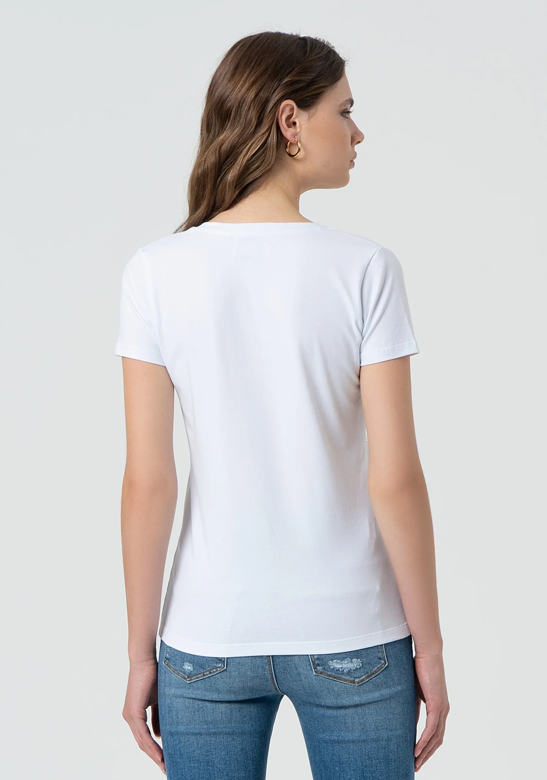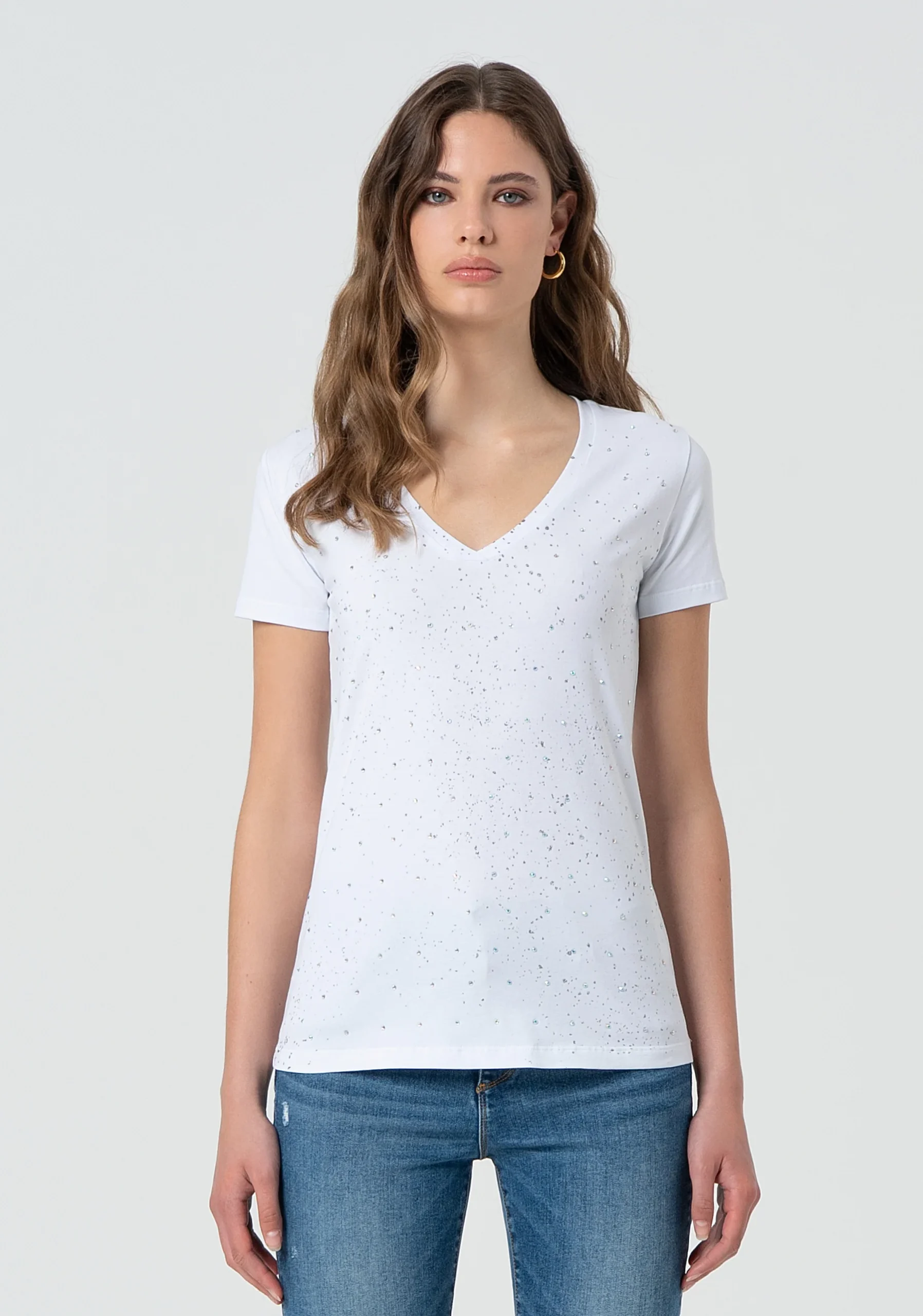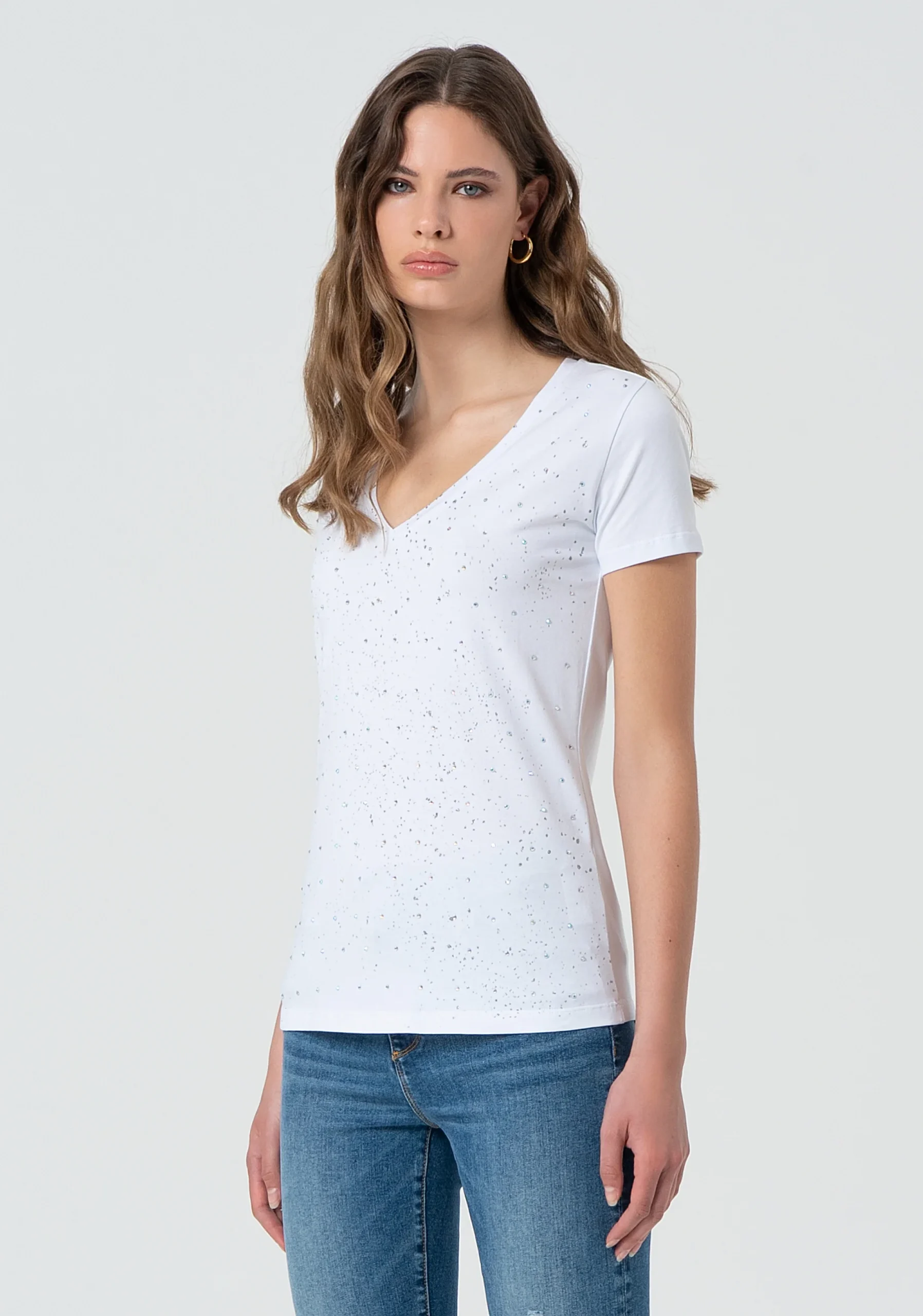 Samarreta entallada de cotó elàstic amb detall brillant. Aconsegueix un look còmode i sofisticat amb aquesta samarreta de tall entallat, confeccionada en jersei de cotó elàstic que s’adapta perfectament al cos sense perdre la comoditat.